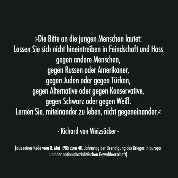 Zum 40 Jahrestag der Beendigung des Krieges in Europa am 8. Mai 1985 hat Richard von Weizäcker folgende Rede gehalten, die auch mich sehr bewegt hat und die ich voll unterstreichen