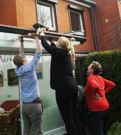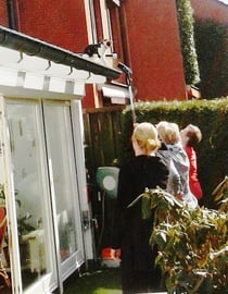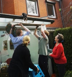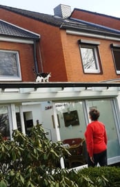 Eine Nacbarskatze hatte sich auf unsere Wintergärten verirrt und versuchte von dort wieder herrunter zu kommen. Gott sei Dank leisteten unsere Jungs und Mirja Hilfestellung. Das Ende vom Lied war jedoch, dass die Katze direkt heruntergesprungen ist.
