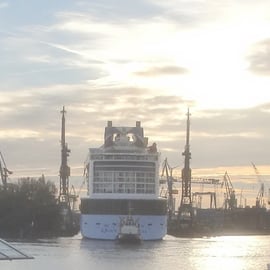 Kurz vor seiner Auslieferung an die US-Reederei Royal Caribbean International (RCI) wird das 348 Meter lange Schiff noch einmal in der Hansestadt durchgecheckt. Die "Quantum of the Seas" wurde für die Inspektion ins Trockendock Elbe 17 von Blohm + Voss eingedockt. Unter anderem werden letzte Einstellarbeiten an den Bugstrahlern vorgenommen.