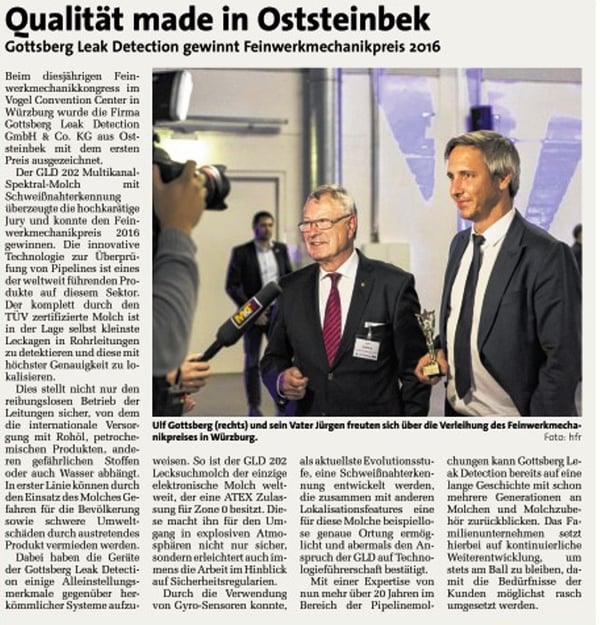 Stephan`s Firma, die Firma Gottsberg, hat den "Deutschen Feinmechanikerpreis 2016" bekommen für ein Produkt, für das Stephan der Project Engineer ist: Den